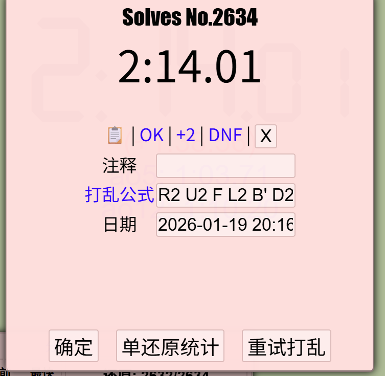 2'14''01。这回是11个公式的pb,记忆用时1'15'',拧用了59'',非常连贯,可能是因为睡好觉了,果然还是要早睡。